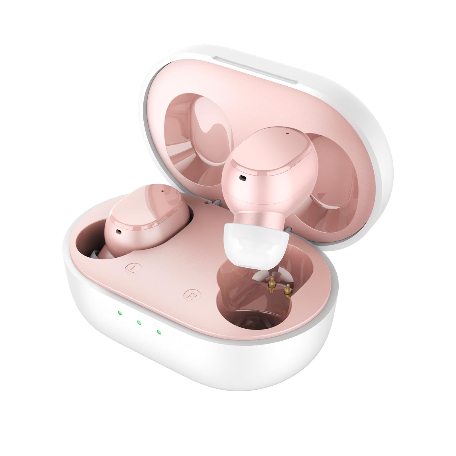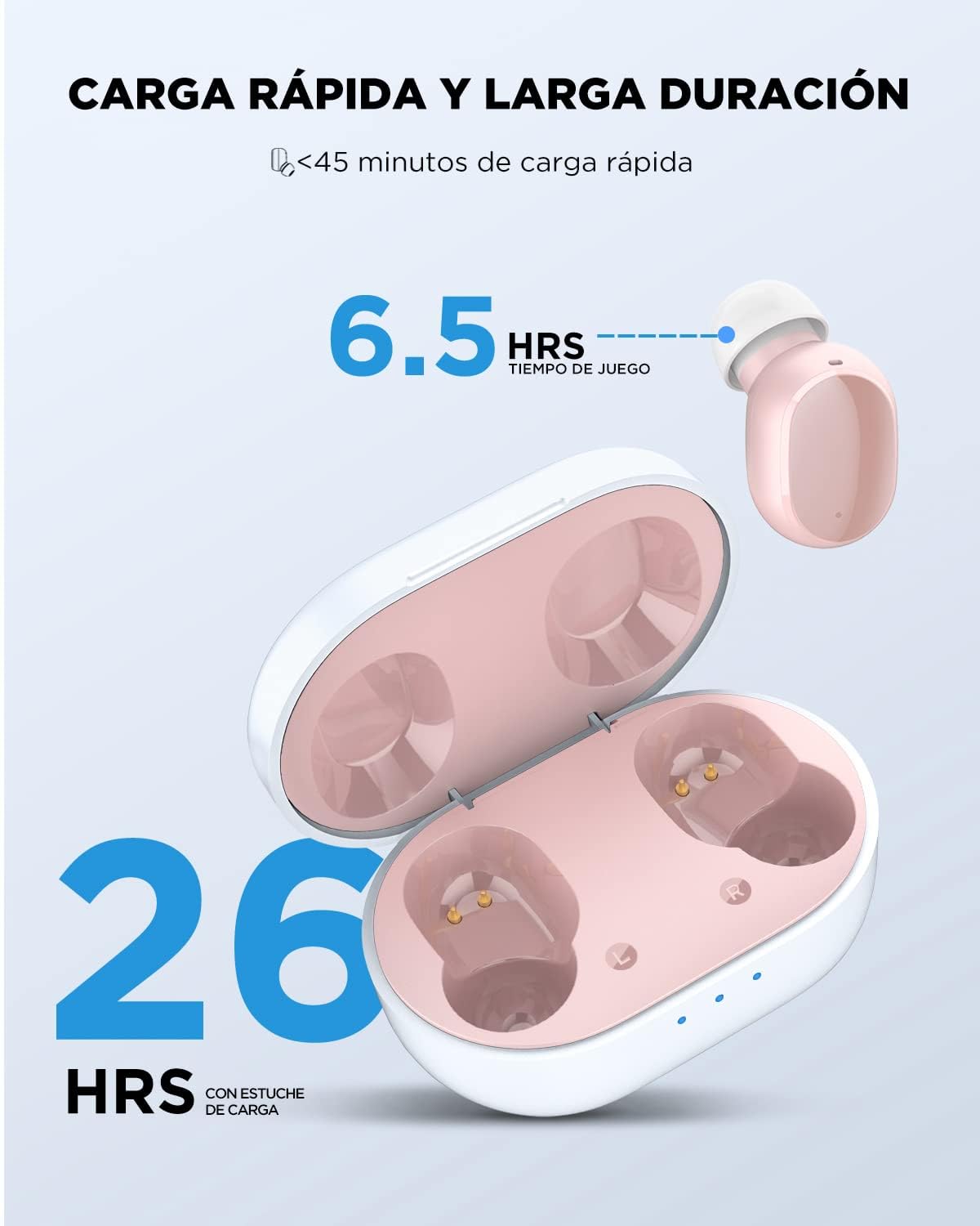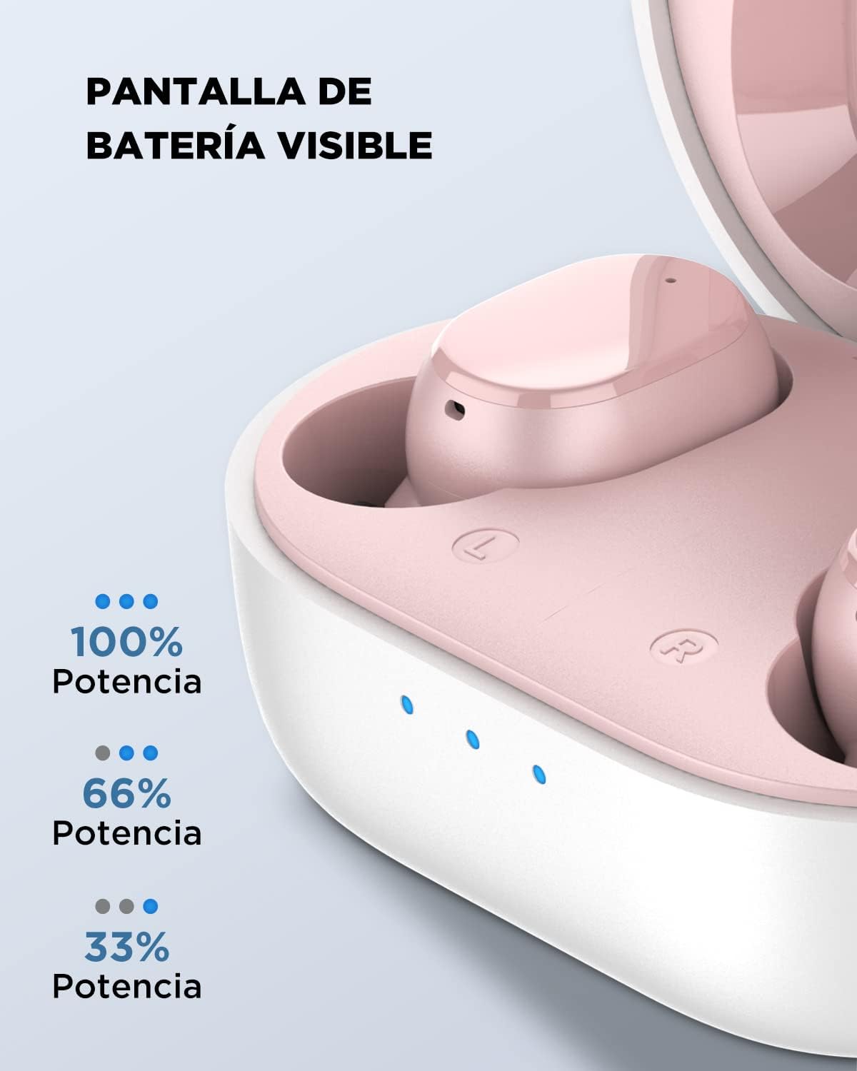 Indicador de Batería Inteligente: El estuche de carga cuenta con un indicador de tres luces para mostrar el nivel de batería restante. Tres luces encendidas indican carga completa, mientras que una luz parpadeante en azul señala que es hora de cargar el estuche.