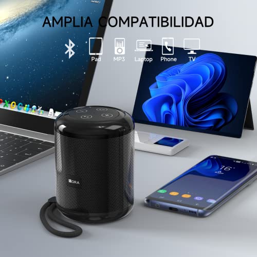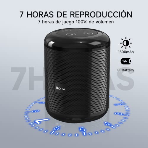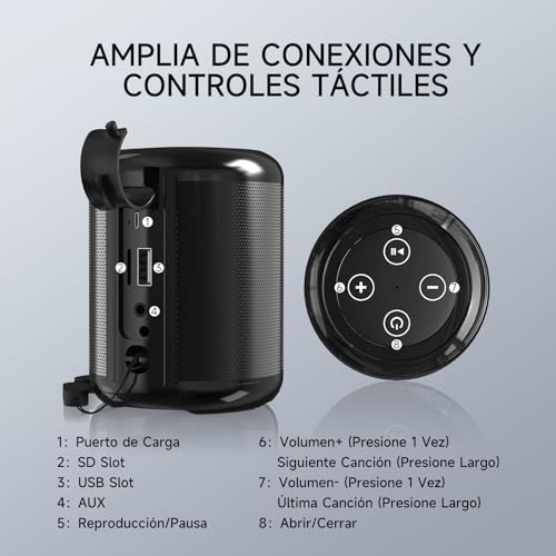 Conexión Estable: El altavoz inalámbrico Bluetooth 5.1 tiene una velocidad rápida de transmisión inalámbrica y una transmisión estable, puede reproducir música a larga distancia y es compatible con la mayoría de los dispositivos, para disfrutar fácilmente de la felicidad de la música. No solo puede reproducir música a través de la conexión de su móvil inteligente, sino también con una tarjeta TF o un lector de tarjeta USB. Amplia Compatibilidad: La mini bocina Bluetooth puede emparejar con cualquier dispositivo de Android, IOS, portátil, tableta, televisor inteligente u otros más. Los bocina Bluetooth 5.1 con altavoces incorporados pueden responder fácilmente la llamada. Fácil de llevar: Mini altavoz Bluetooth, fácil de transportar, con tamaño 72,7*96,15 mm, peso 286g, es adecuado para entorno de entretenimiento, de oficina, interior, exterior, senderismo, playa, etc. Puede disfrutar de la buena música en su cine de casa, fiesta, playa, parque o en cualquier lugar con una cuerda de nailon, para que pueda colgarla fácilmente en su ropa, mochila o bicicleta. Batería de Larga Duración: La bocina Bluetooth tiene una batería recargable de litio incorporada de 1500mAh, con una carga de 4 horas, puede disfrutar de 7 horas de reproducción (100% del volumen), o hasta 10 horas de reproducción (80% del volumen). Gran Sonido con Bajos Profundos: Esta bocina Bluetooth emite un rico sonido de 360 grados a través de un conductor de alta sensibilidad y un puerto de bajo, incluyendo un soprano detallado y un bajo satisfactorio.